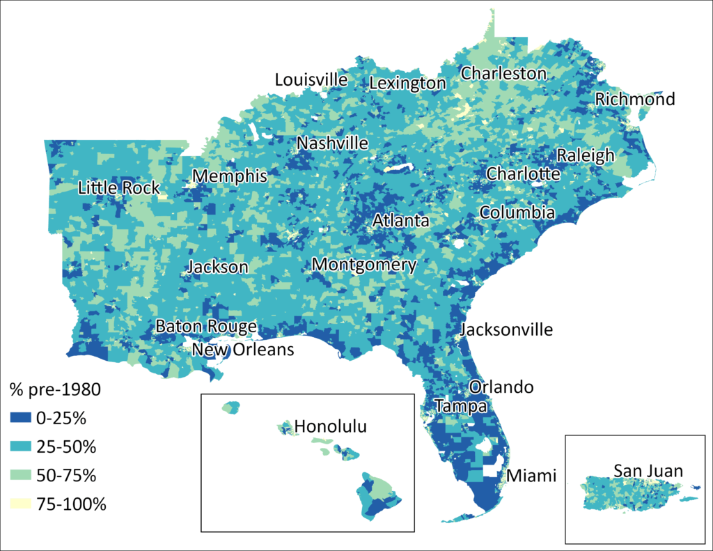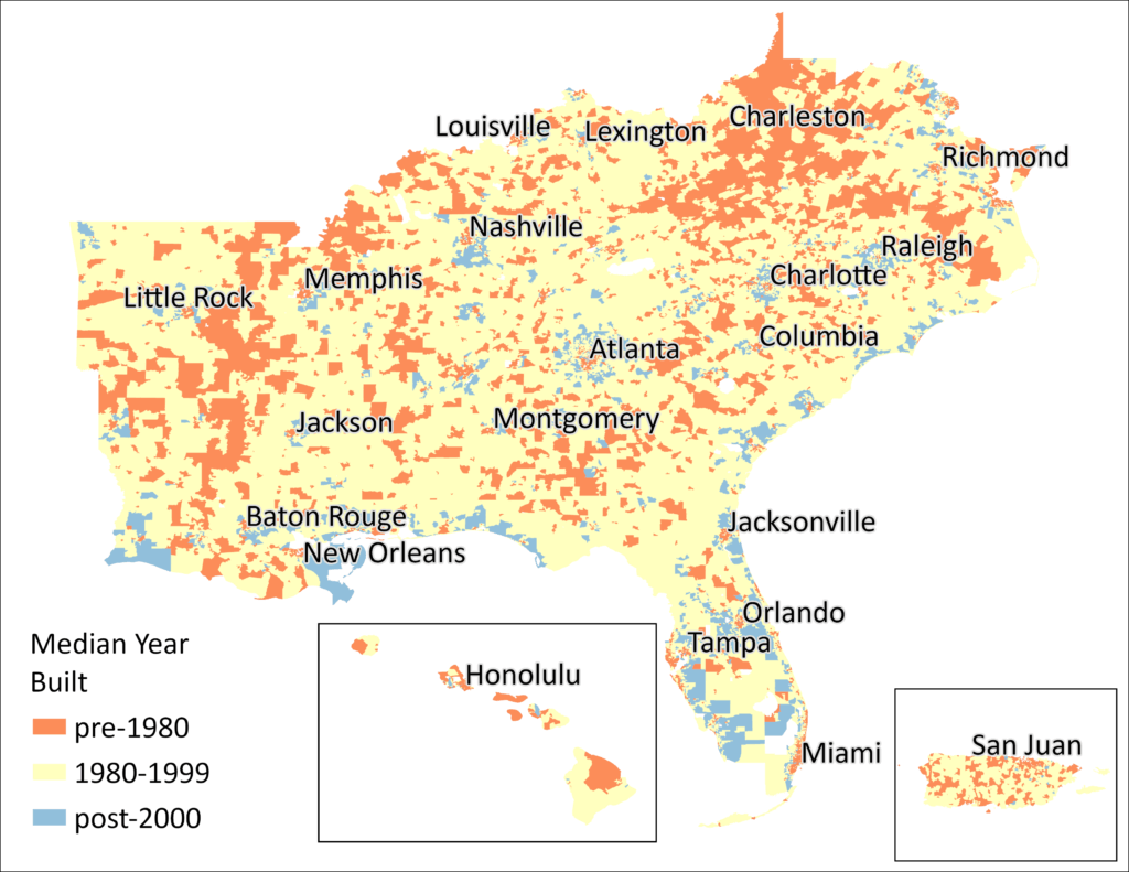 This month’s map illustrates the percentages of southeastern homes that were built over different time spans, and the median year of construction. Data are estimated at the census tract level, representing 40 million homes in the region, based on the U.S. Census Bureau’s American Community Survey (ACS) from 2023.