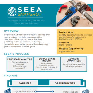 This resource is an executive summary of SEEA’s research on opportunities to increase the market transformation and deployment of HPWHs. It offers a high-level overview of the major barriers to HPWH adoption, identifies key solutions and opportunities, and provides an overview of current HPWH utility rebate offerings in the Southeast.