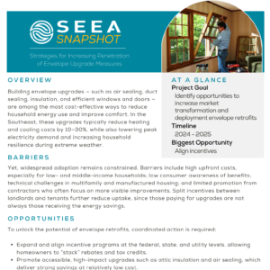 This resource is an executive summary of SEEA’s research on opportunities to increase the deployment of envelope retrofit measures. It offers a high-level overview of the major barriers to envelope adoption, identifies key solutions and opportunities, and provides an overview of current envelope utility rebate offerings in the Southeast.