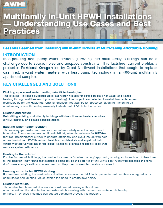 A new factsheet from the Advanced Water Heating Initiative outlines best practices for installing heat pump water heaters (HPWHs) in multifamily buildings. Based on insights from an ongoing 400-unit retrofit project, the guide highlights key lessons from replacing in-unit gas water heaters with HPWHs, alongside ductless heat pumps for space heating.